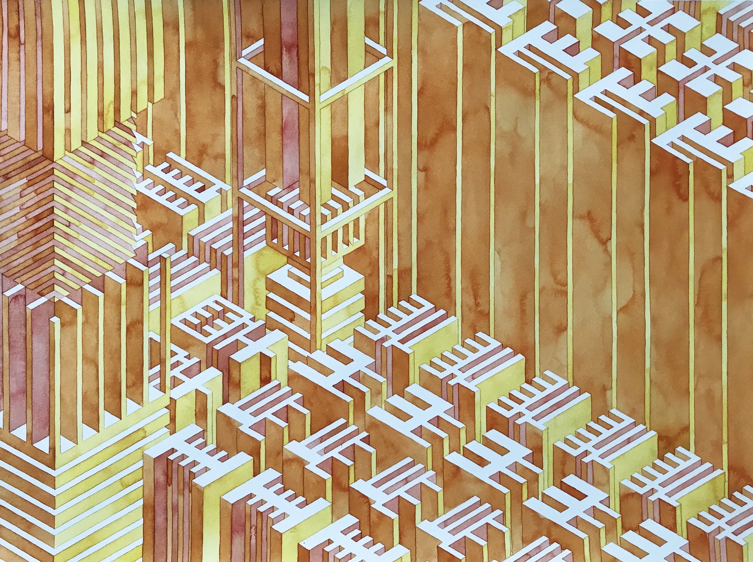 Nick Naber’s (b. 1986, lives and works in Brooklyn, NY) work draws on the visual language of penitentiaries, New York City corporate landscape, and Brutalist/Modernist architecture, the work emerges from a myriad background of sources to create dystopian visions of imagined cities. His works organize themselves in the linear likeness of maps and Modernist Utopian cities, creating a hierarchy of structures intersecting and organizing space.